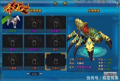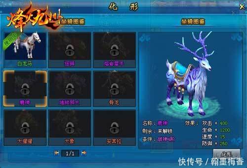 如果说动物生存的意义在于进化,那么《烽火九州》当中坐骑成长的目标就在于化形。其实世间大部分的动物都没有化形的能力,而这匹传说中的白龙马显然是个例外,当白龙马达到一定的条件之后,它就会拥有化身为某种神兽的能力。当然神兽化形并不是毫无限制的,其中有的对白龙马的等级有一定的要求,有的需要玩家获得某种称号,有的则需要以大量的荣誉点数兑换方能获得。化形之后的白龙马将会彻底消失,与此同时新的坐骑将为玩家提供更加强大的属性加成和辅助技能。