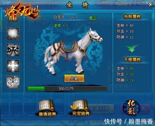 在游戏中,坐骑进阶需要消耗一定数量的金钱才能进行培养,培养的过程虽然缓慢但是其中有很大的几率出现暴击,当坐骑培养出现暴击时宠物将得到十倍于普通培养所获得的经验。此外,当坐骑培养到三十级后,便可以学习与其对应的坐骑技能,坐骑的等级每提升十五级,坐骑技能也会随之进化到更高的等级。以白龙马为例,当白龙马到达60级时,除了移动速度和属性的增强之外,还可以使玩家额外增加1000点的防御力。