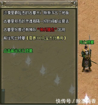 在决战王城里,有一个神秘而又恐怖的陵墓,陵墓内的稀世宝藏成了众多冒险玩家争夺的目标。太多太多冒险家进了墓地之后就没有出来过了,所以死亡陵墓也是这种陵墓的名字。为了防止过多盗墓者的打扰,所以陵墓的位置是相当隐秘的。玩家必须要在沙漠之城寻找到神秘的NPC美女相助,没有好处是不会理你的噢,一旦金币到手后,玩家便已传送进入了传说中的死亡陵墓了。